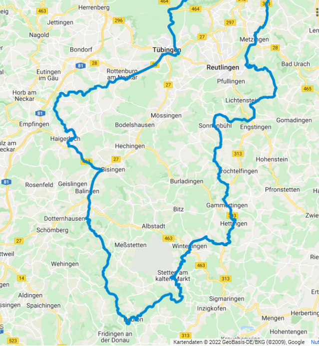 Somit fahre ich eine Tour über die Alb, am Lauchertsee vorbei, Stetten a.k.M. , Donautal bis Beuron, Bärenthal, Lochenpass, Haigerloch, Rottenburg, Tübingen, Waldenbuch …
