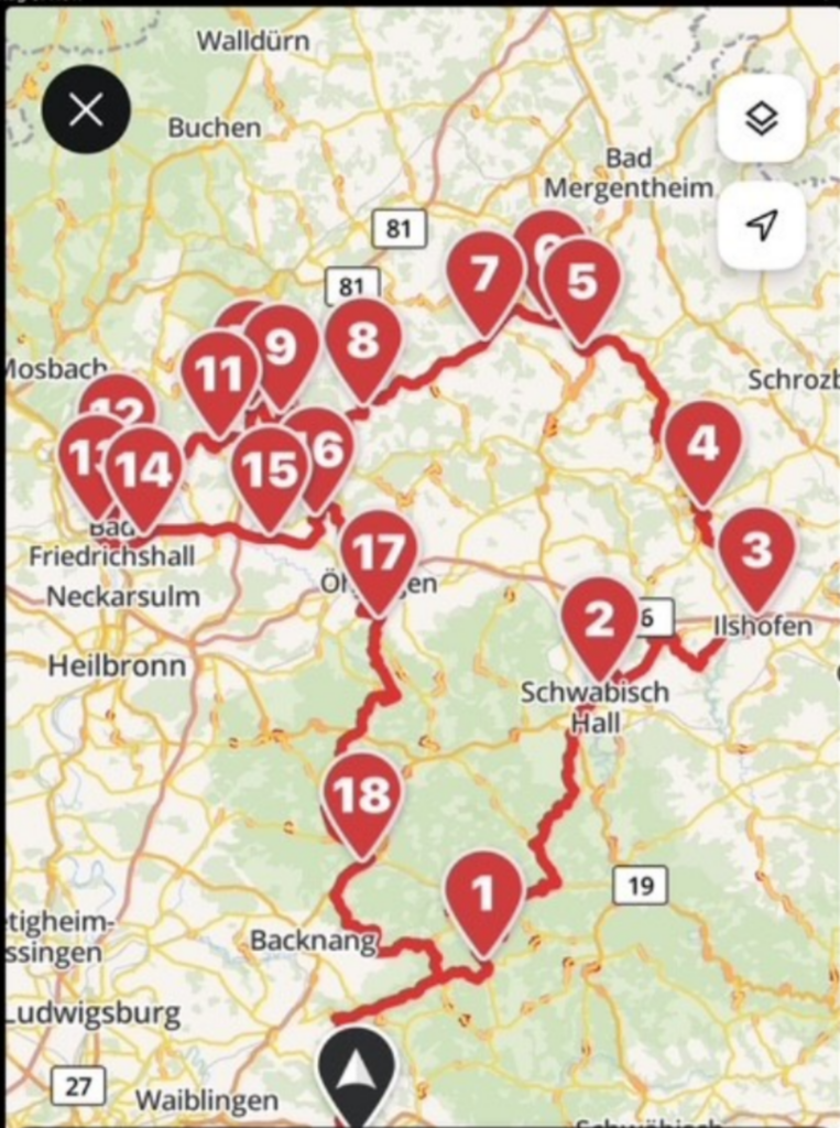 mit wenig befahrenen, kurvenreichen Landstraßen.Mal schmiegen sich malerische Straßen an Kocher und Jagst entlang, dann wieder schlängeln sich kurvenreiche Strecken hinauf auf die Hohenloher Ebene.