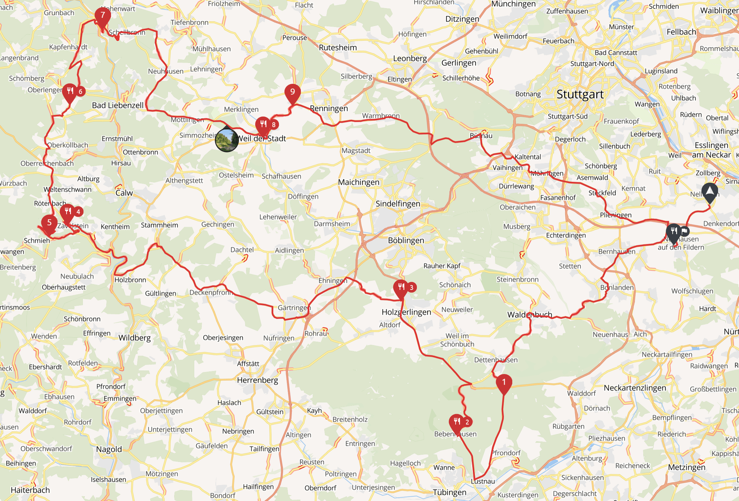 Wir werden durch den Schönbuch Richtung Schwarzwald fahren und unseren Abschluss diesmal mit mehr Auswahl (Peter) ebenfalls im Biergarten geniessen.