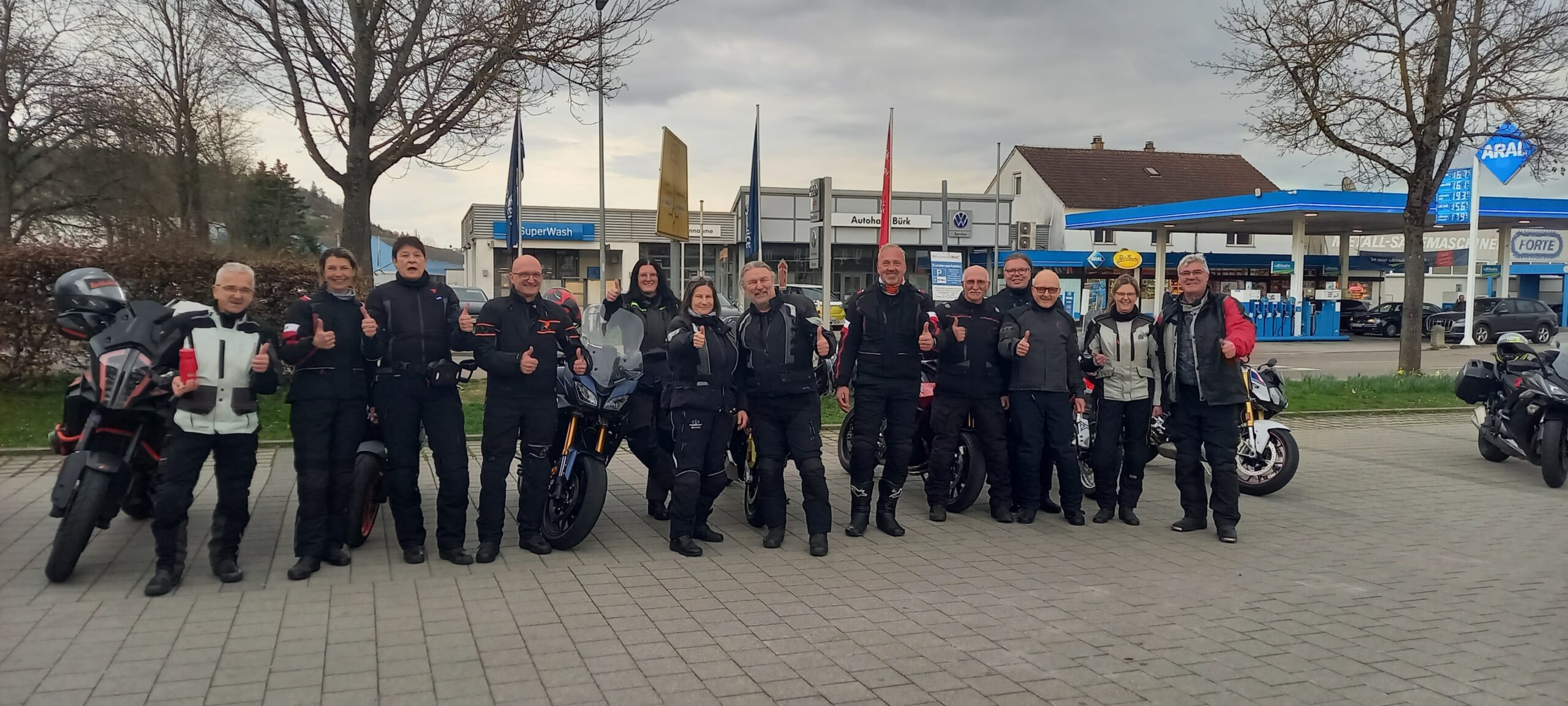 (genug gegendert) mit 13 Motorrädern am 23.03. ein paar Minuten vor 10:00 Uhr in Ebersbach an der Fils an der Avia Tankstelle. Die klare Vorgabe lautete: Vollgetankt und abfahrbereit um 10:00 Uhr – das schafften alle rechtzeitig – ist halt ein eingespielter Haufen. Jo, getroffen hatte man sich also schon mal, aber bei „abfahrbereit“ konnten nicht alle grünes Licht melden. Die Yamaha von Dieter ließ ihn und Hanna ziemlich unvermittelt im Stich und wollte nicht mehr anspringen – Batterie tot.
