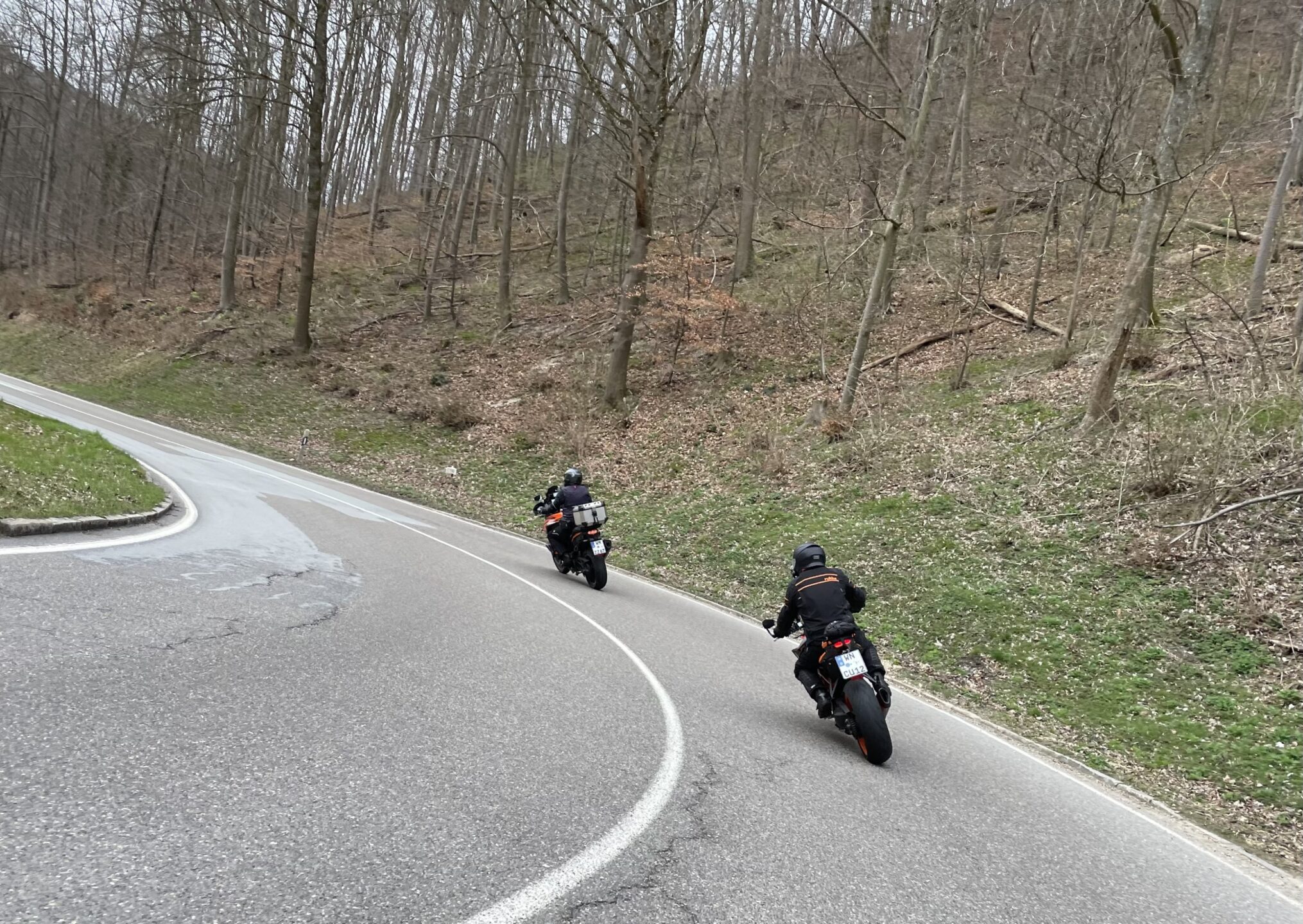 War es schlimm – „nein“, aber sicherlich außergewöhnlich. Hätte das schief gehen können – natürlich auch „nein“. Denn anscheinend hatte diese Weste noch nie so viel Schräglage erfahren wie am heutigen Tag (Originalzitat von Wolfgang). D.h. für den eh schon extrem unwahrscheinlichen Fall, Mitte März, bei gerade mal knapp zweitstelligen Temperaturen auf eine tatsächliche Harley Davidson Gruppe zu treffen, die den Schwindel hätte bemerken können, wäre einfach die Devise gewesen: Rechte Hand macht die Landschaft schneller und Augen zu und durch 😉