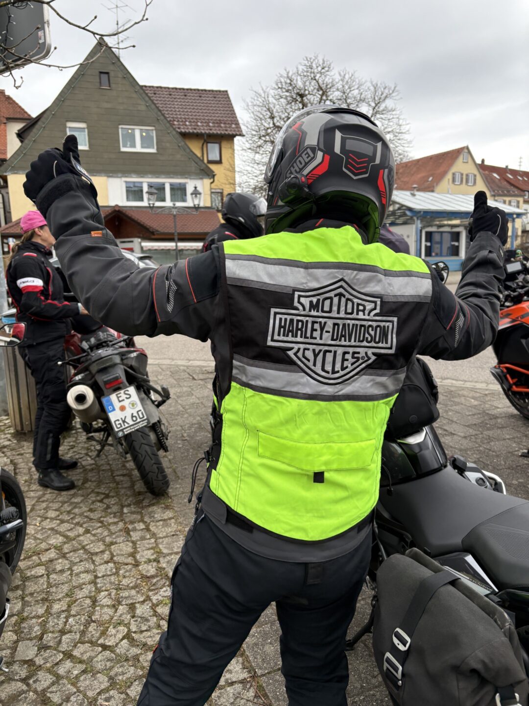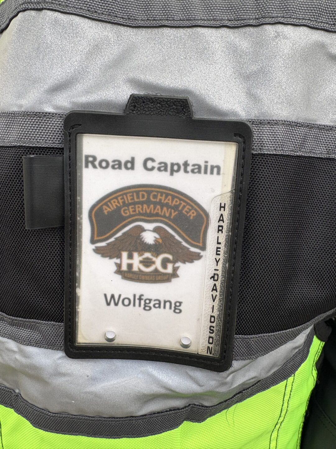 Achso – „unter falscher Flagge“ – stimmt, das bin ich euch noch schuldig. Da Armin (Team Rotkehlchen) ja leider nicht dabei sein konnte, ist kurzerhand „Road Captain“ Wolfgang als Fahrer des letzten Motorrads eingesprungen. Als gut sichtbares Erkennungszeichen hatte Wolfgang eine ganz besondere Warnweste zu bieten: Eine Warnweste mit rückenfüllendem Harley Davidson Logo – also sind wir den ganzen Tag unter falscher Flagge gefahren (oh ooh).