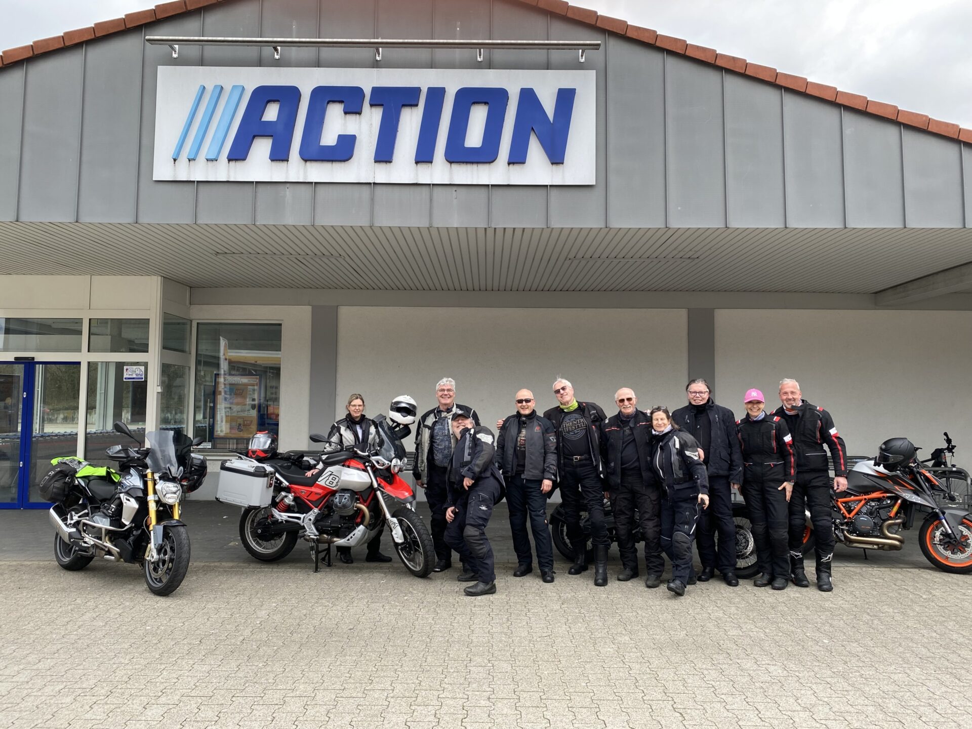 gab es die erste Kaffeepause und ein erstes Gruppenfoto. Einzelne Personen, die nicht mit auf dem Foto sind, die waren dann irgendwie schon im Kaffee-Modus – aber mein Motorrad ist mit drauf 😉