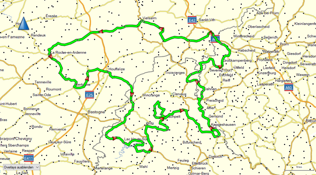 Dann wird es mit dem Kurvengeschlängel weitergehen – Himmelsrichtung nun in Richtung Nord-West. Ein sehr abwechselndes Höhenprofil begleitet uns auf dem Großteil der Strecke. Wahrscheinlich verlassen wir kurzfristig auch das Hoheitsgebiet von Luxemburg und drehen den Umkehrschwung unserer Tour in Belgien. Nochmal einen Bogen durch Luxemburg und dann gen Norden zurück zum Quartier.