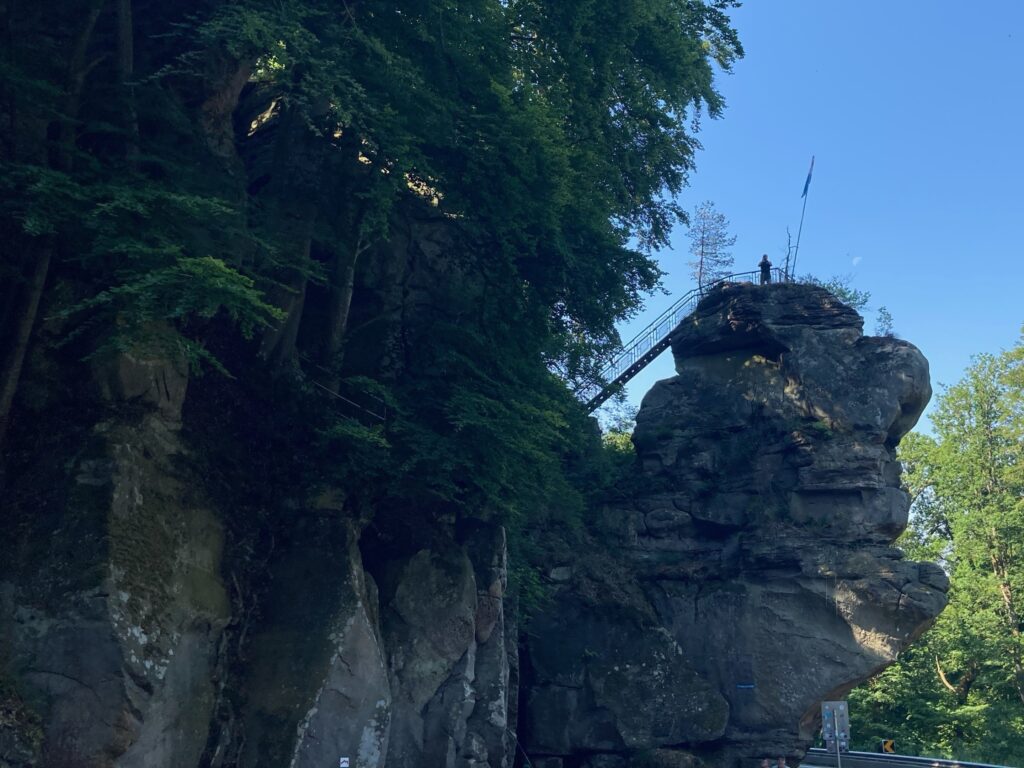 Unser nächstes Highlight ist dann das direkt anschließende Müllerthal mit seinen berühmten Wasserfällen, den Waldmassiven, die von Wasserläufen durchzogen sind, Biotope aus denen hohe Sandsteinformationen herausragen, enge Felspassagen, geheimnisvolle Höhlen und Schluchten und deswegen auch als kleine luxemb. Schweiz bekannt. Wollen wir hoffen, dass man auch von der Straße erahnen kann, wie herrlich dieses Wandergebiet ist. Von Echternach fahren wir wieder an der Sauer entlang um zur Our zu kommen und verlassen dann Luxemburg und winden uns zur Unterkunft zurück und der Kreis schließt sich.