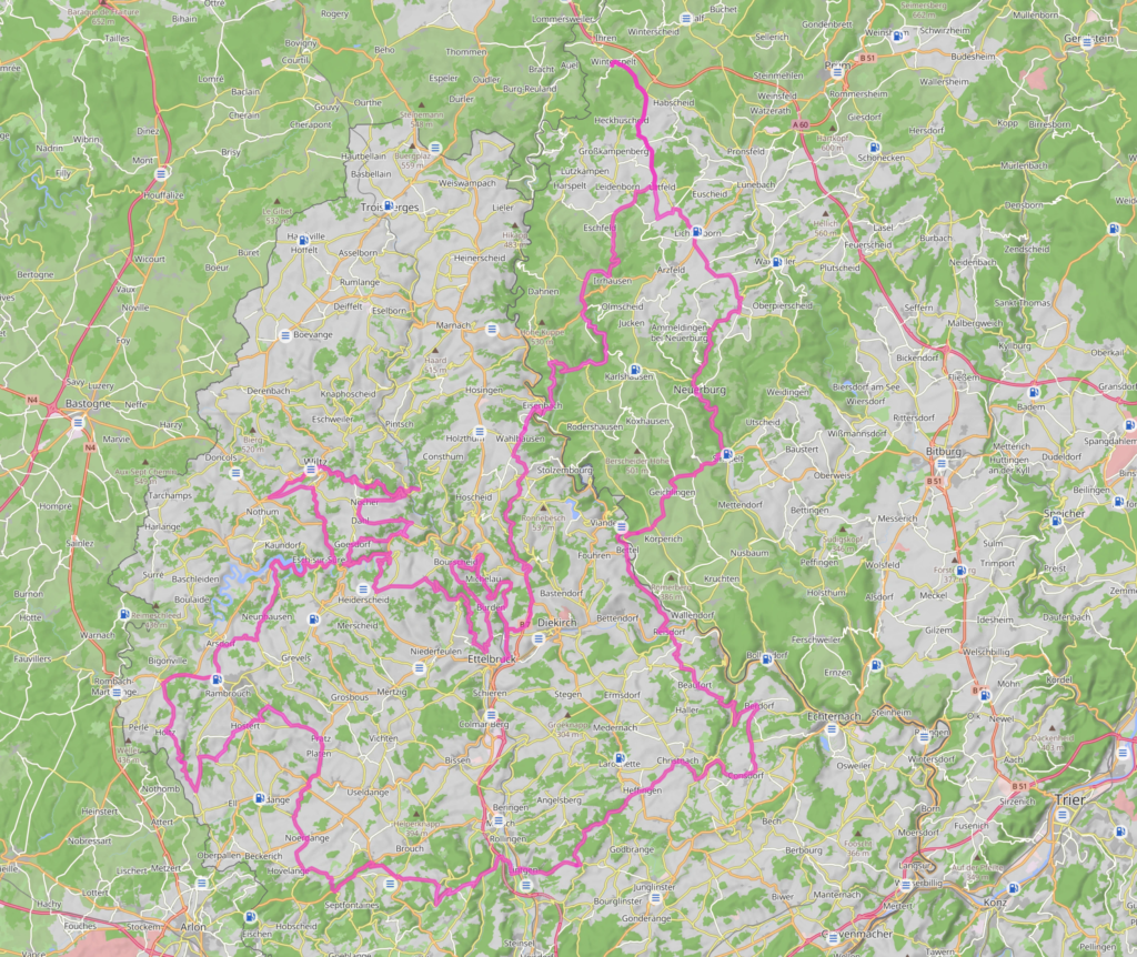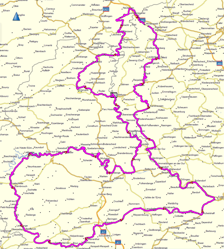 Auf Höhe von Trier wird Luxemburg von Ost nach West durchquert – den kurvigen Straßen folgend mit ein paar größeren Schlenkern. Kurz vor Belgien dreht die Fahrtrichtung in Richtung Norden. Danach wird Luxemburg wieder von West nach Ost durchquert – nicht unbedingt geradlinig, sondern eher mäanderförmige Streckenführung. Auch hier immer der Fokus auf kurvige Straßen.