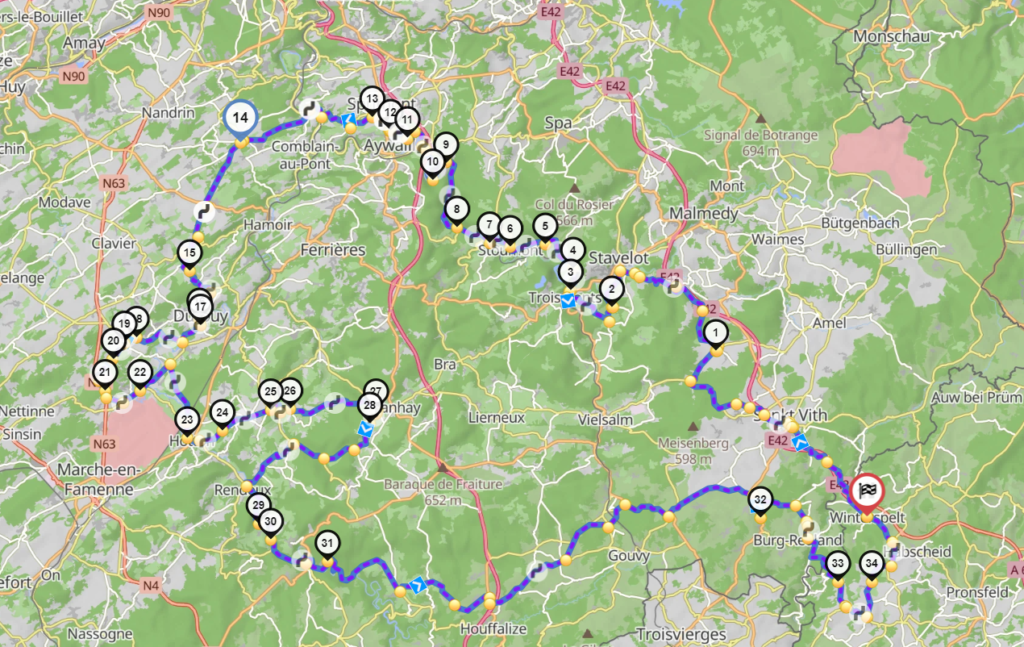 Auf dem Rückweg überqueren wir den höchsten Punkt der belgischen Ardennen und fahren weiter auf schönen Nebenstraßen zurück nach Winterspelt.