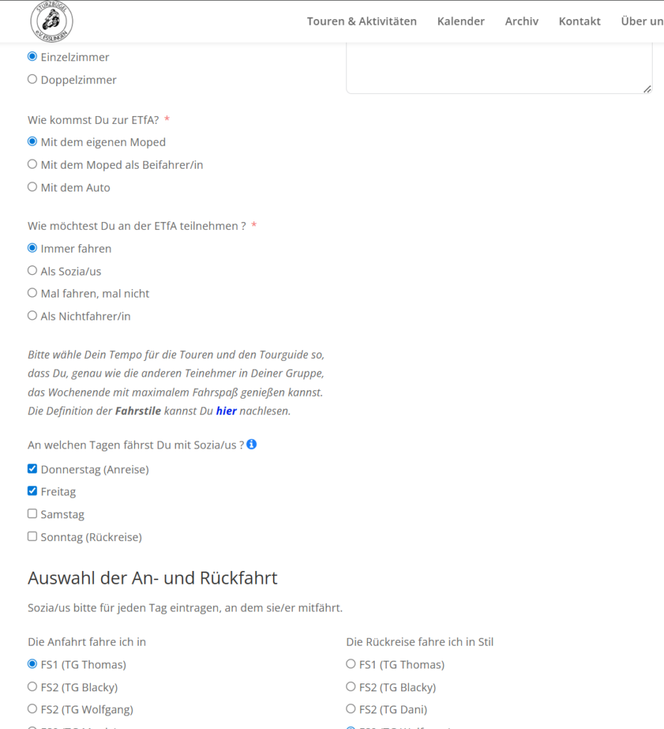 Damit ihr nicht so viel tippen müsst, habe ich zum Anmelden neue Formulare bekommen. Manche davon sind tatsächlich selber ein bisschen intelligent (natürlich nicht mit mir zu vergleichen) aber immerhin. Die Anmeldung zur ETfA (ihr wisst schon, dass das „Eine Tour für Alle“ heisst und da nur die Vereinsheimer mitdürfen), also diese Anmeldung fragt echt alles ab und meldet euch gaaanz automatisch beim Hotel an. Also echt auf dem Weg zur KI diese Formulare.