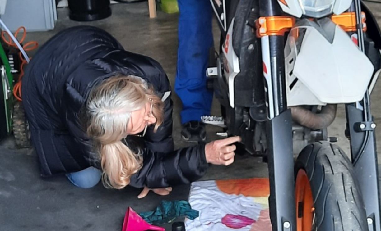 Armin begann den Workshop mit einigen Fragen was man prüfen sollte wenn man das Motorrad nach dem Winter aus der Garage holt. Womit er jeden mit einbezog und auch alle interresiert zugehört haben. Nach Check von Bremse, Licht und Co. war dann auch der Ölwechsel dran. Was sich bei der kleinen KTM als sehr aufwendig heraus stellte, aber dafür auch sehr interresant war. Also nicht nur für Laien und Anfänger.
