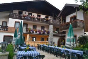 Unser Domizil ist der Schweizerhof in Wonneberg. Das liegt zwischen dem Chiemsee und dem Waginger See. Dort gibt es einen schönen Biergarten, einen Pool mit Liegewiese und wir werden mit gutbürgerlicher, bayrischer Küche verköstigt.