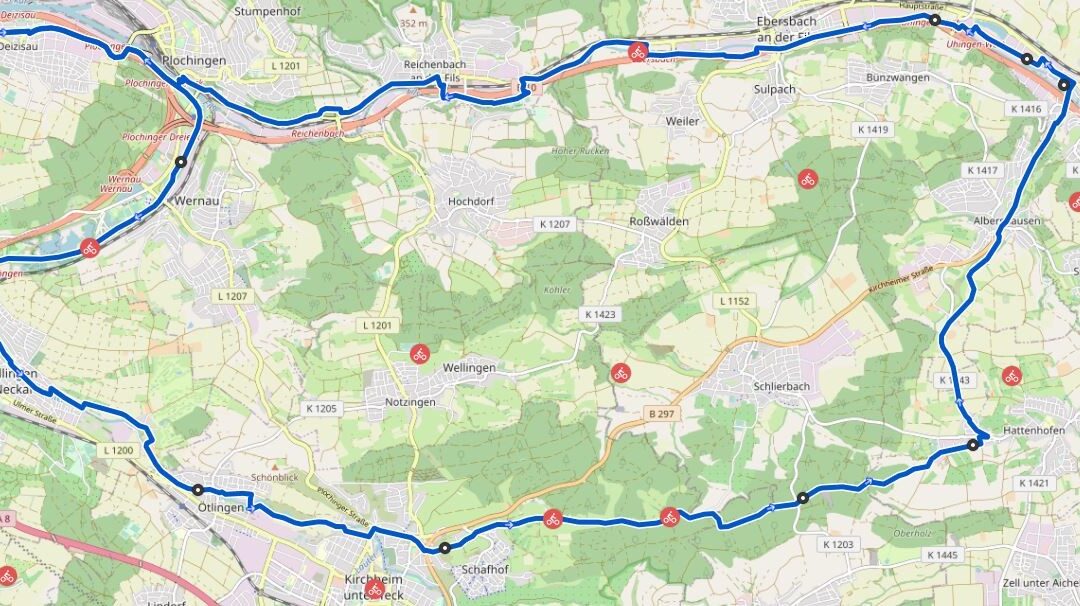 Frisch gestärkt rollen wir gemütlich filsabwärts nach Ebersbach. Dor können wir entscheiden, ob Kondition und Sitzfleisch noch einen Abstecher durch das Kirnbachtal auf den Schurwald vertragen. Die Strecke würde an Lichtenwald vorbei zum Kaisersträßle und weiter durch Hohengehren zum Schlösslesplatz zwischen Baltmannsweiler und Aichschieß führen, bevor es über die Orgel runter geht nach Altbach rüber zum Ausgangspunkt in Deizisau.