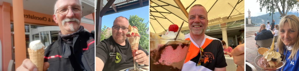 Der Titelverteidiger von 2019, Armin, startete hochmotiviert und reichte schon im Februar das erste Foto „Eisdiele da Claudia Ellwangen, 93km” ein. Insgesamt wurden dann von den 10 Teilnehmer/innen 126 Eisdielen und 21.635 km gemeldet. „Daun, Eisdiele Fontanello“ von Armin mit 428 km war die weiteste, „Nellingen by Rino“ 6 km von Manni die kürzeste Strecke von Zuhause bis zur Eisdiele. Zwar hatte Siggi ein Foto aus „Caldonaco de Lago“ mit 599 km eingereicht, da aber die Anreise von Zuhause aus nicht komplett mit dem Motorrad stattfand, kam diese Meldung nicht in die Wertung. Einige Teilnehmer, zu denen auch ich gehöre, hatten öfter mal einfach die richtige Reihenfolge vergessen: