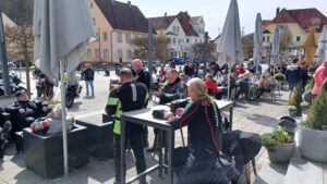 Mittagessen in der versprochenen Brauereigaststätte in Bad Schussenried. Bei vollem Sonnenschein, einer netten Bedienung und vorzüglichen Speisen war das Glück vollkommen. Also für fast alle. Denn Detlef war erst zufrieden als auch seine Heidi eintraf. Sie war mit dem Cabrio angereist und wollte uns auf dem Heimweg verfolgen (was ihr auch weitestgehend gelang). Und so ein Autofahrer in der Truppe hat Vorteile – das Video wäre ansonsten nicht möglich gewesen. Gestärkt und ausgeruht machten wir uns auf den Heimweg.