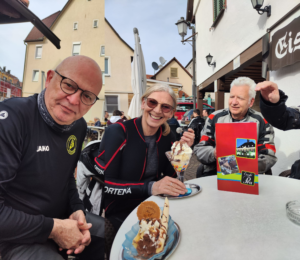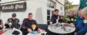 Zum Abschluß in Weilheim wurde die obligatorische Eisdiele aufgesucht und auch noch die (für die meisten) erste Mitteilung zur EDE- Challenge an Sigrid geschickt. Nach 4 1/2 Stunden Fahrzeit und etwa 280km waren dann doch alle glücklich dem Ende entgegen zu sehen.