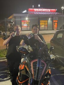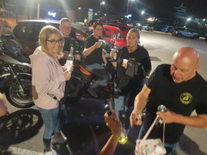 Der Abend war so mild und einladend, dass wir beschlossen, die Party im Freien mit unseren Mopeds zu feiern. Mit Bier, Jägermeister und verschiedenen Schnäpsen bewaffnet, verbrachten wir einen unvergesslichen Abend in bester Gesellschaft unserer geliebten Maschinen. Was für ein Tag – die Kurven, die Herausforderungen und schließlich die ausgelassene Feier, die den Tag auf wunderbare Weise abschloss.