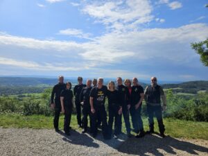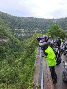Unser Tourguide Armin und Simone hatten erneut eine atemberaubende Route durch das Französische Jura für uns geplant, gespickt mit wunderschönen Kurven und atemberaubenden Ausblicken. Schon bald legten wir an einem malerischen Aussichtspunkt in Chatillon einen Fotostopp ein und nutzten die Gelegenheit für ein Gruppenfoto, bei bis jetzt, schönstem Wetter.