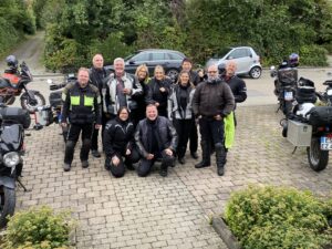 Über Tübingen fuhren wir, den schnellsten Weg zu Sigrid, die hatte uns einen Kaffee versprochen, wenn wir Sie bei Ihrer Firma abholen würden. Und so geschah es, dass wir bald bei Sigrid eintrafen und in ihrer Firma den heiß ersehnten Kaffee genossen. Gestärkt durch den heißen Kaffee ging es dann nach einem Gruppenfoto von unserer bunten Truppe, die aus 10 Mopeds und 10 abenteuerlustigen Fahrern:innen und einer Sozia bestand, los.