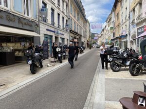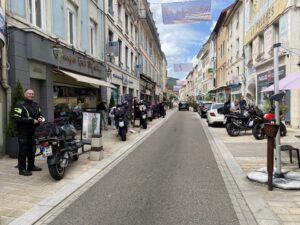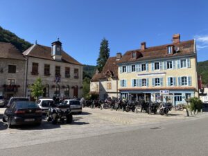 Die Kurven, oh die Kurven! Sie waren einfach phänomenal, und der Fahrspaß kannte keine Grenzen. Doch auch die abenteuerlustigsten Biker brauchen ab und zu eine Pause. Wir hielten in der bezaubernden Stadt Saint-Claude an, um uns in einem charmanten Café zu stärken. Unsere Bikes parkten direkt vor unseren Augen und waren ebenfalls in bester Gesellschaft.