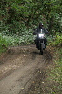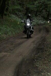 Selbstverständlich mussten nicht nur wir gestärkt werden, sondern auch unsere treuen Maschinen verlangten nach Kraftstoff. Also steuerten wir eine nahegelegene Tankstelle an, bevor wir wieder auf unsere Route zurückkehrten. Doch oh Schreck, was war das? Die Straße endete plötzlich in einer Baustelle! Keine Panik – mit Hilfe von freundlichen Radfahrern fanden wir einen Waldweg, der uns um die Baustelle herumführte. Angeblich war dies für Radfahrer ein Klacks. Ehrlich gesagt, ich hatte kurzzeitig einen Moment der Nervosität. Der Weg, den ich vor mir sah, schien eher für Bergziegen als für mich und mein “Äffle” gemacht zu sein.
