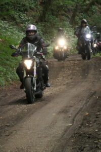 Dennoch entschied sich die Mehrheit, den Waldweg zu nehmen, und so setzten wir unsere abenteuerliche Fahrt fort. Ecki führte die Gruppe mutig an, und der Rest von uns folgte tapfer. Mein Herz raste, als ich sah, welche Herausforderung vor uns lag – mit großen Steinen und feuchtem Untergrund. Aber hey, nach vorne geschaut und durch! Ecki und Silke standen plötzlich vor uns und hielten den Moment auf Fotos fest. Schließlich mussten diese heldenhaften Momente dokumentiert werden. Trotz entgegenkommendem Verkehr schafften wir es alle heil durch diesen anspruchsvollen Abschnitt, und ja, stolz waren wir allemal.