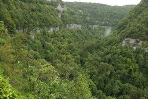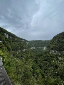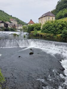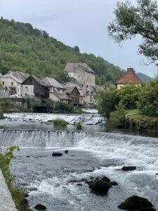 Trotz anhaltenden Regens fuhren wir weiter und erreichten schließlich das bezaubernde Örtchen Château-Chalon. Dieses Dorf, das als eines der schönsten in ganz Frankreich gilt, beeindruckte uns zutiefst. Es liegt auf einem Vorsprung des ersten Juraplateaus. Wir erkundeten die malerischen Straßen und machten in der Kirche Saint-Pierre eine besondere Erfahrung, als Cat uns mit ihrer wunderschönen Stimme berührte. Sie sang für uns „Laudate Dominum von Wolfgang Amadeus Mozart und Pie Jesu von Endrew Lloyd Webber aus Requiem“ Ein Gänsehautmoment – danke dafür liebe Cat.