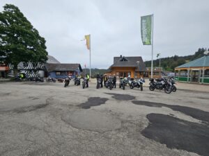 Der Tag begann nach einem ausgiebigen Frühstück mit dem Beladen unserer Bikes und einem schweren Abschied von diesem paradiesischen Ort. Unsere Tourguides, Simone und Armin, zeigten keinerlei Erbarmen und trieben uns zur Abfahrt. Pünktlich um 09:00 Uhr brachen wir auf und durchquerten zuerst einen Teil der Schweiz. Auf unserem Weg stießen wir auf ein verwirrendes Straßenschild, das wir nicht sofort deuten konnten. Kurzerhand suchten wir nach einer alternativen Route, die sich jedoch als Sackgasse herausstellte. Zum Glück war es erneut Cat, die uns rettete und bestätigte, dass wir hier ohne Strafen weiterfahren durften. Die Straßen waren anfangs so schmal, dass sie kaum als solche zu erkennen waren. Mittlerweile verfügten wir jedoch über ausreichend Offroad-Erfahrung und bewältigten diese Strecke mit beeindruckender Leichtigkeit. Der sanfte Nebel verlieh der Umgebung zudem eine zauberhafte, beinahe mystische Atmosphäre.