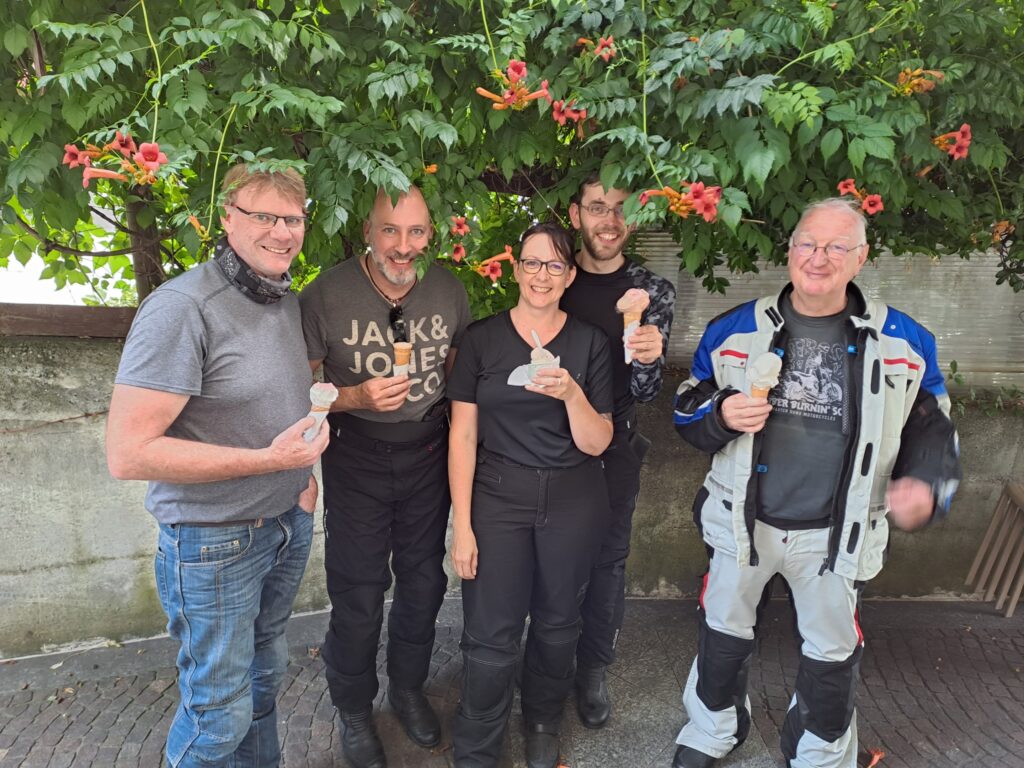 Am Locarno-See entlang führt uns das Navi über eine kehrenreiche Halbhöhenstraße durch das Villenviertel von Locarno. Cool! Das Centovalli wird dann der Karussellfahrt die Haube aufsetzen– Das Karussell ist jetzt in voller Fahrt! Es geht keine 5 Meter geradeaus und wir fegen durch die Kurven wie die Tänzer beim Walzer. Eine Kurve geht in die nächste über. Mehr Kurven geht nicht. Unter dem Helm geht die Kommunikation mit Einwürfen wie “Aah wie geil!” – “boh, ist das toll!” – “das hört ja gar nimmer auf!” und so schwingen wir uns über etliche Kilometer, bis uns fast schlecht wird, in Richtung Simplon-Pass. Auf der Strecke finden wir eine Eisdiele und Wolfgang gibt eine Runde hausgemachtes Eis aus 🙂