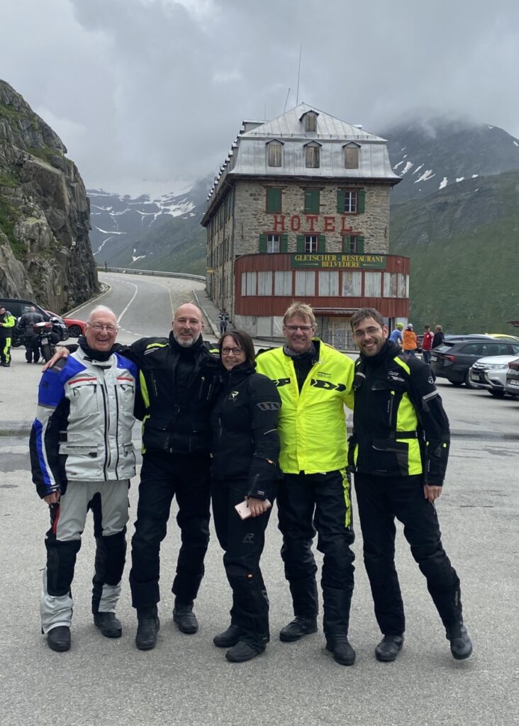 Am Furka stellen wir unsere “Töffs” am Hotel Belvedère und dem Rhone-Gletscher.