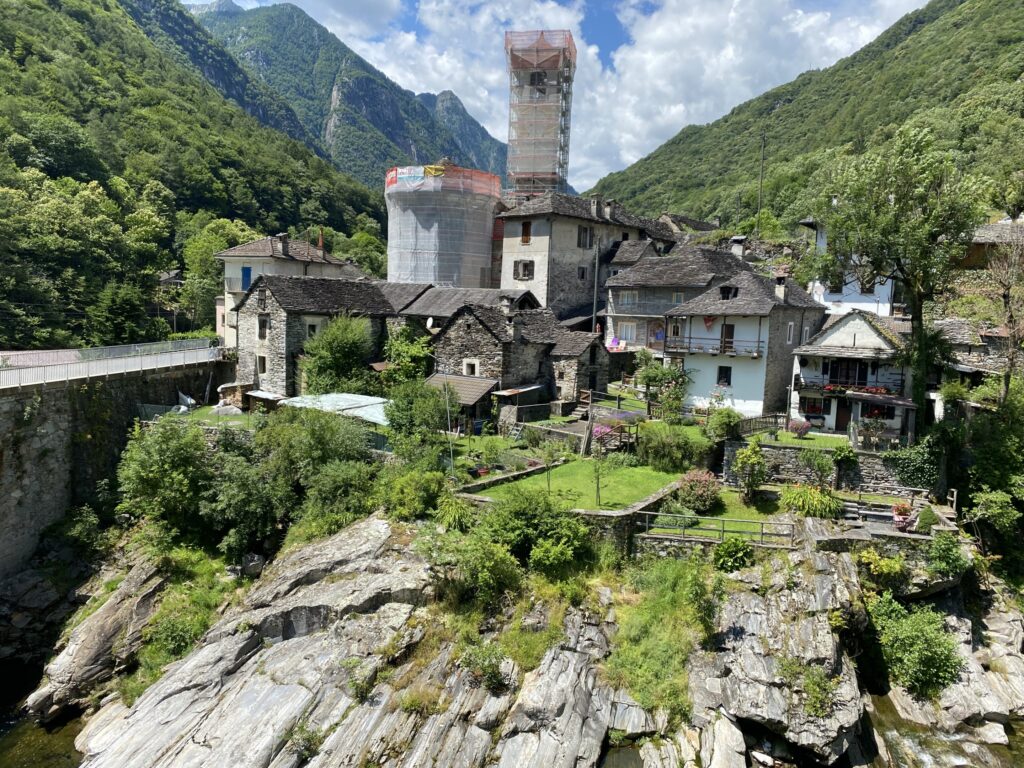 Von Belinzona aus fahren wir in das Verzasca-Tal. Am Staudamm vom Lago die Vogorno machen wir halt und begehen die Staumauer. Hier stürzen sich die ganz harten, ohne mit der Wimper zu zucken, 220m in die Tiefe mit dem Bungee! Hier sprang auch 007 im Film Golden Eye. Uns bleibt das Herz schon vom Zugucken stehen! Weiter oben im Tal kehren wir zu Mittag in der Osteria Vittoria in der malerischen Ortschaft Lavertezzo. Ein idyllisches und schattiges Plätzchen haben wir unter einer großen Platane gefunden.