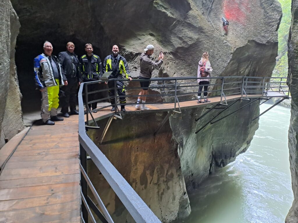 Weiter geht es zur Aareschlucht. Auf schmalen Stegen und Tunnels geht es voran tief in die Schlucht hinein. Sehr beeindruckend, wie sich in tausenden von Jahren das Wasser durch die Felsen gefräst hat. Schautafeln erklären, was wir sehen. Wir laufen nicht bis zum Schluss und kehren nach einer Weile um. Inzwischen hat sich die Sonne den Himmel zurückerobert und drängt uns, uns von den Klamotten zu befreien, die wir zu viel anhaben. Das erinnert uns daran, dass wir noch Getränke einkaufen müssen. Im nächsten Coop decken wir uns ein und ich erinnere mich daran, dass ich für Silke ein Schocki mitnehmen wollte.