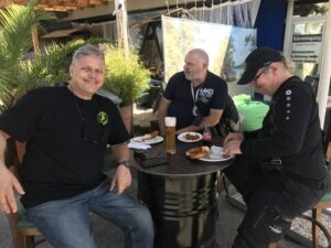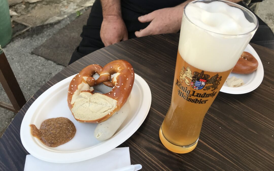 Pünktlich um 9 vor 12 ging es in der Winterbacher Strandbar für 5 und später 6 Sturzbügler plus Lady und Mops mit Weißwurst, Brezel und alkfreiem Bier zum Frühstück los.
